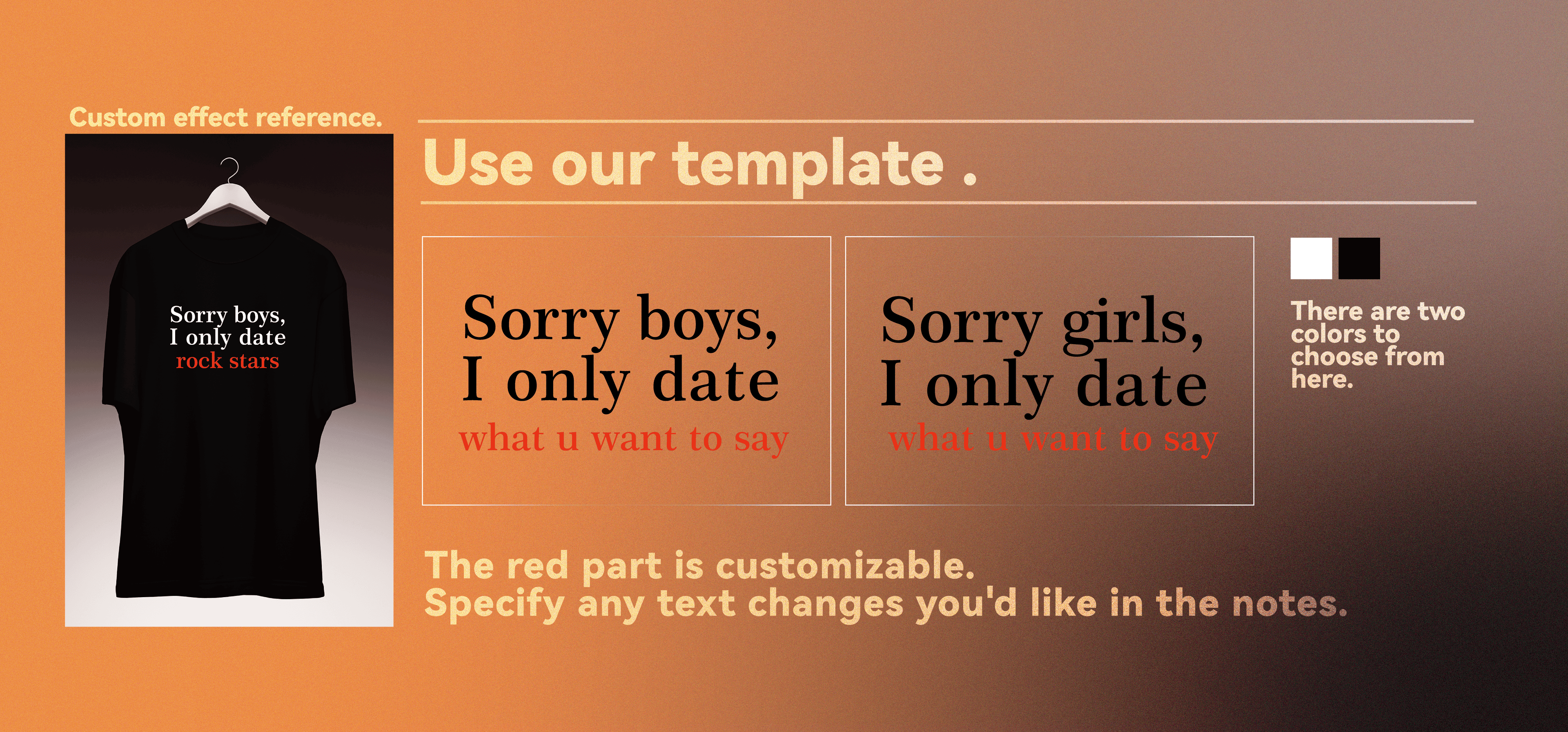 Through this link, you can upload the original images of the patterns you want to customize (including those on the T-shirt). You can leave your customization requirements at checkout or simply write them in the upload image box. Product Specifications Feature Details Material 100%...- $2.99