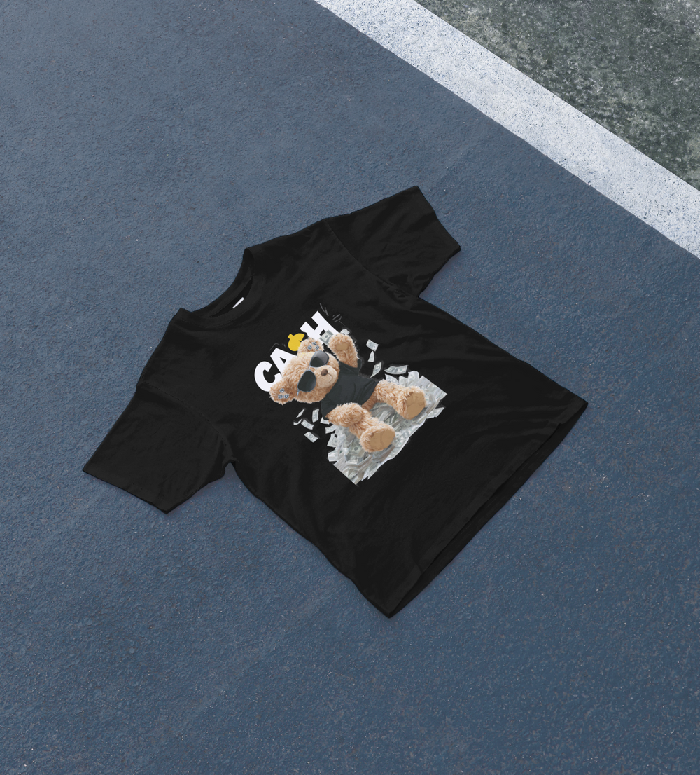 Step into the streetwear scene with this Original DIYANYONE Cotton T-Shirt. It features an exclusive, high-detail graphic of a cool, rich teddy bear wearing shades and studs, sitting on a massive pile of cash under the word "CASH". This design is a bold statement piece, embodying themes of financial success, anti-establishment attitude, and hip-hop luxury.