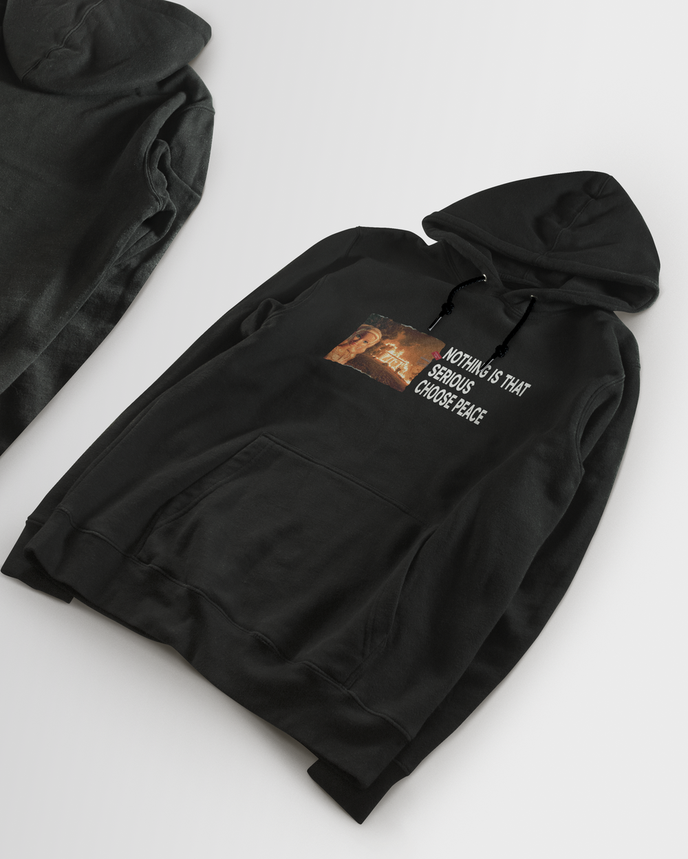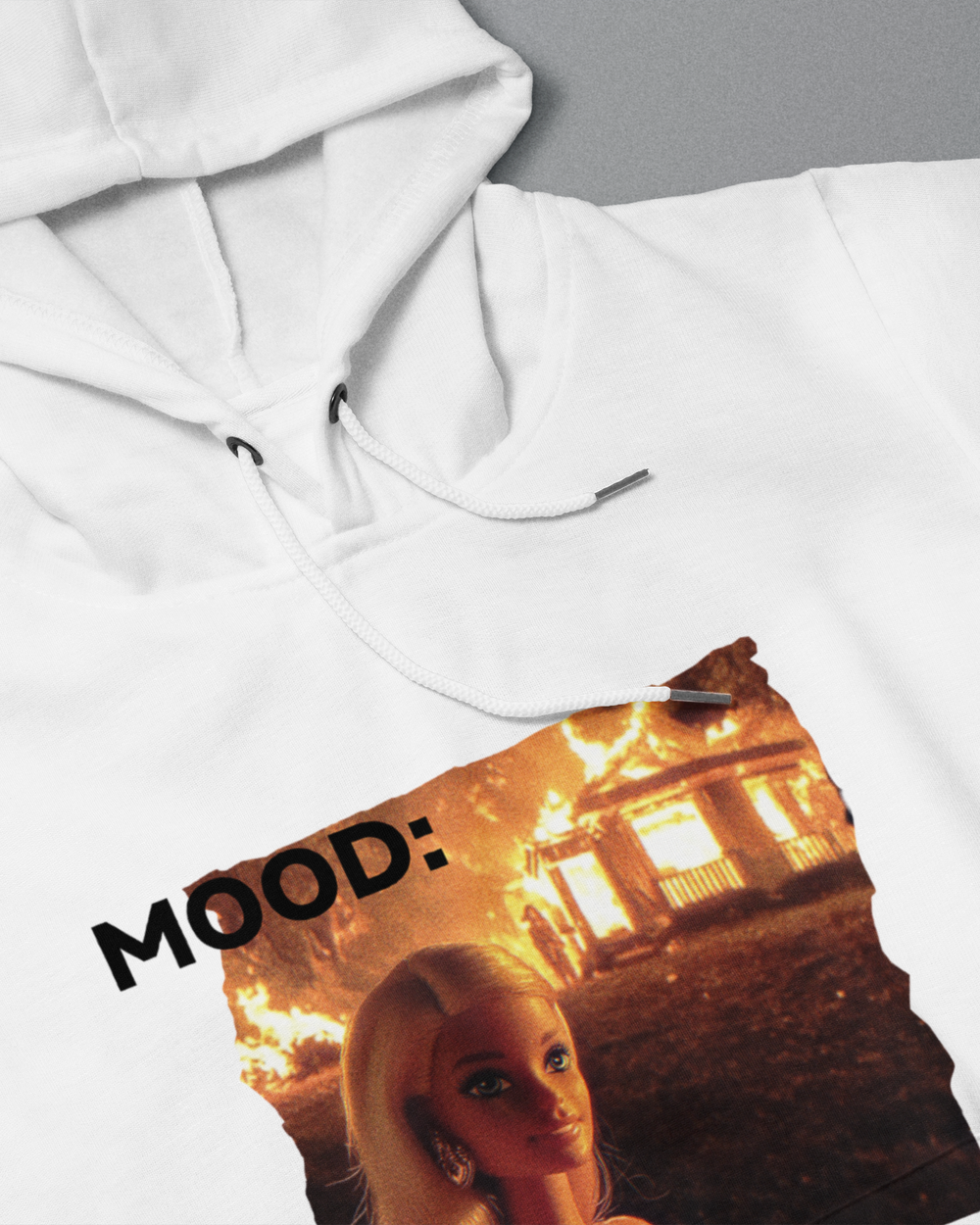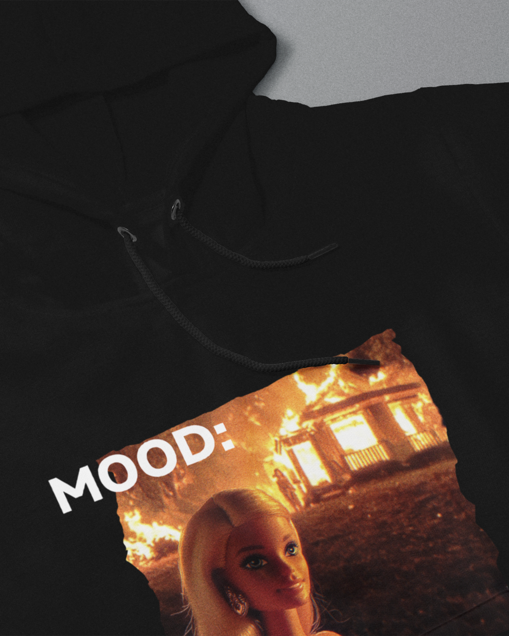 Keywords: heavyweight dark humor meme pullover hoodie, barbie burning house graphic hoodie, DIYANYONE original viral internet sweatshirt, pop culture ironic outerwear, choose peace statement pullover, unbothered attitude hoodies
