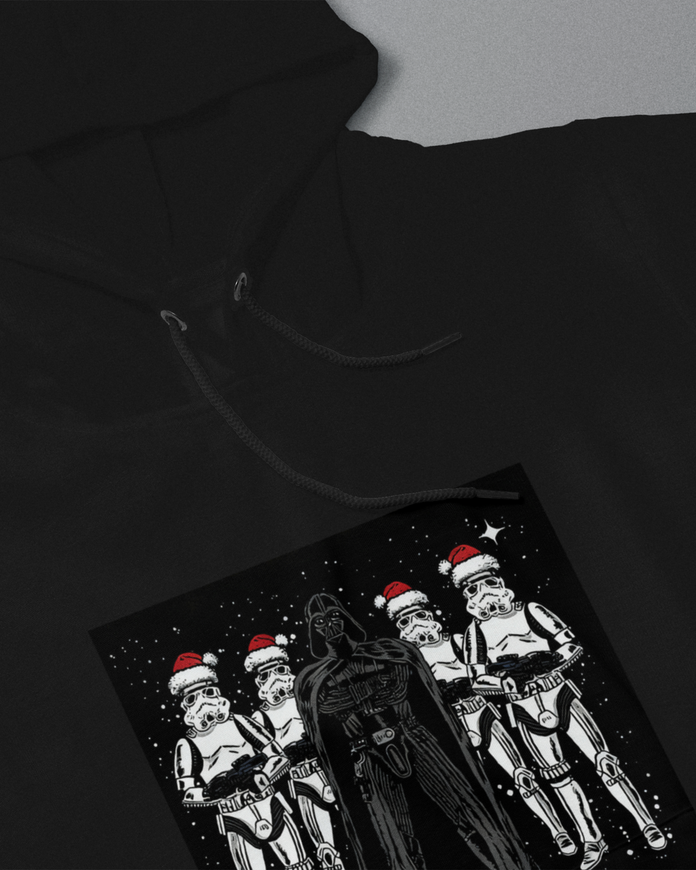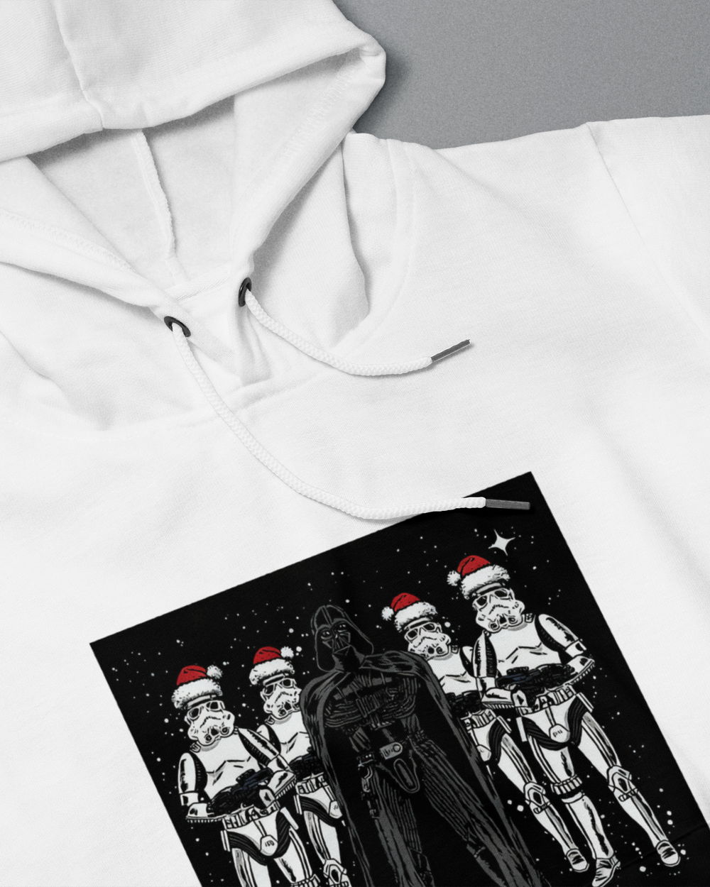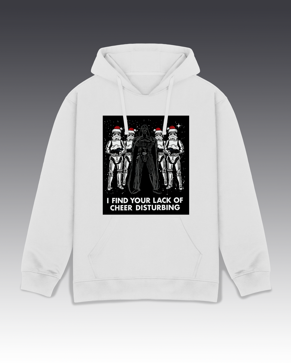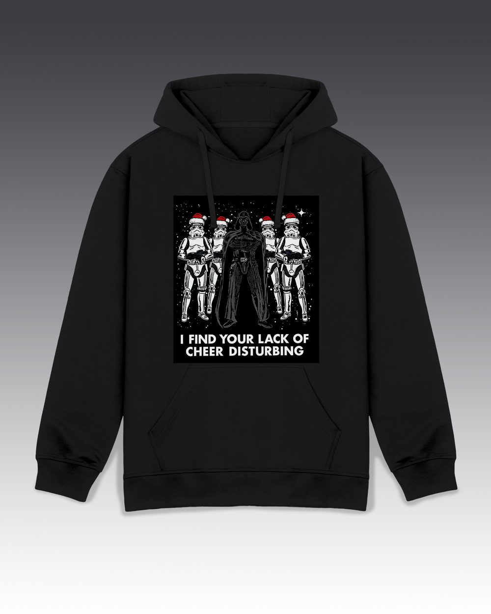 The ultimate fan statement Hoodies! Features Darth Vader and Stormtroopers with the iconic phrase: "I FIND YOUR LACK OF CHEER DISTURBING." Perfect for fans of the dark side who need a dose of holiday humor (or sarcasm). Premium quality soft cotton.