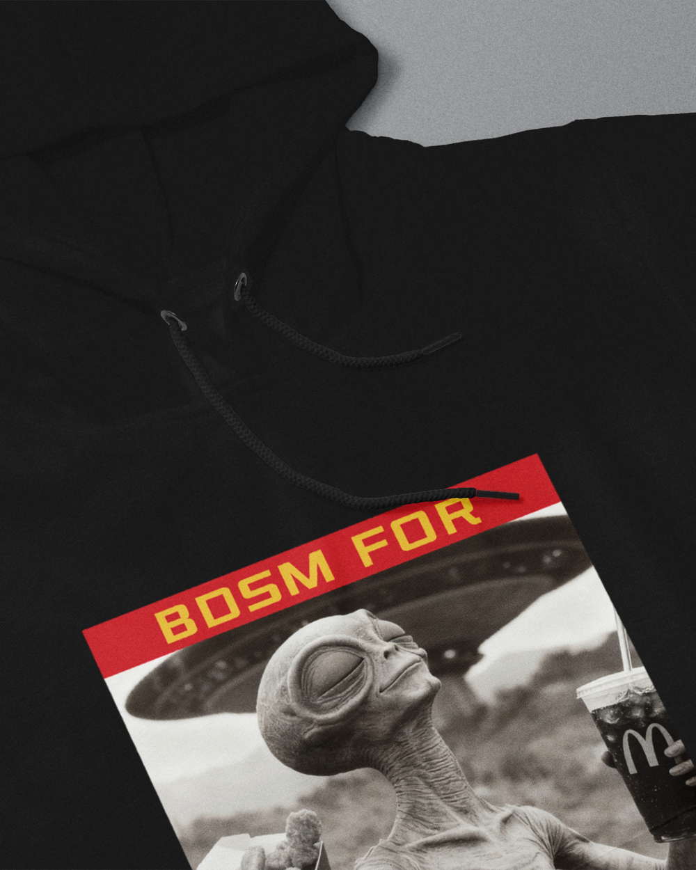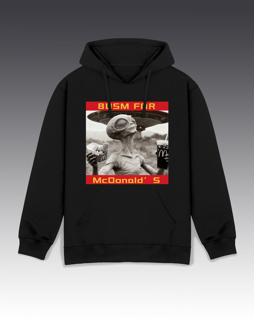 Keywords: Alien McDonald's Meme Hoodie, Fast Food Devotion Sweatshirt, UFO Abduction Humor, Sci-Fi Satire Apparel, Galactic Comfort Food, DIYANYONE Original, Ironic Fan Gear