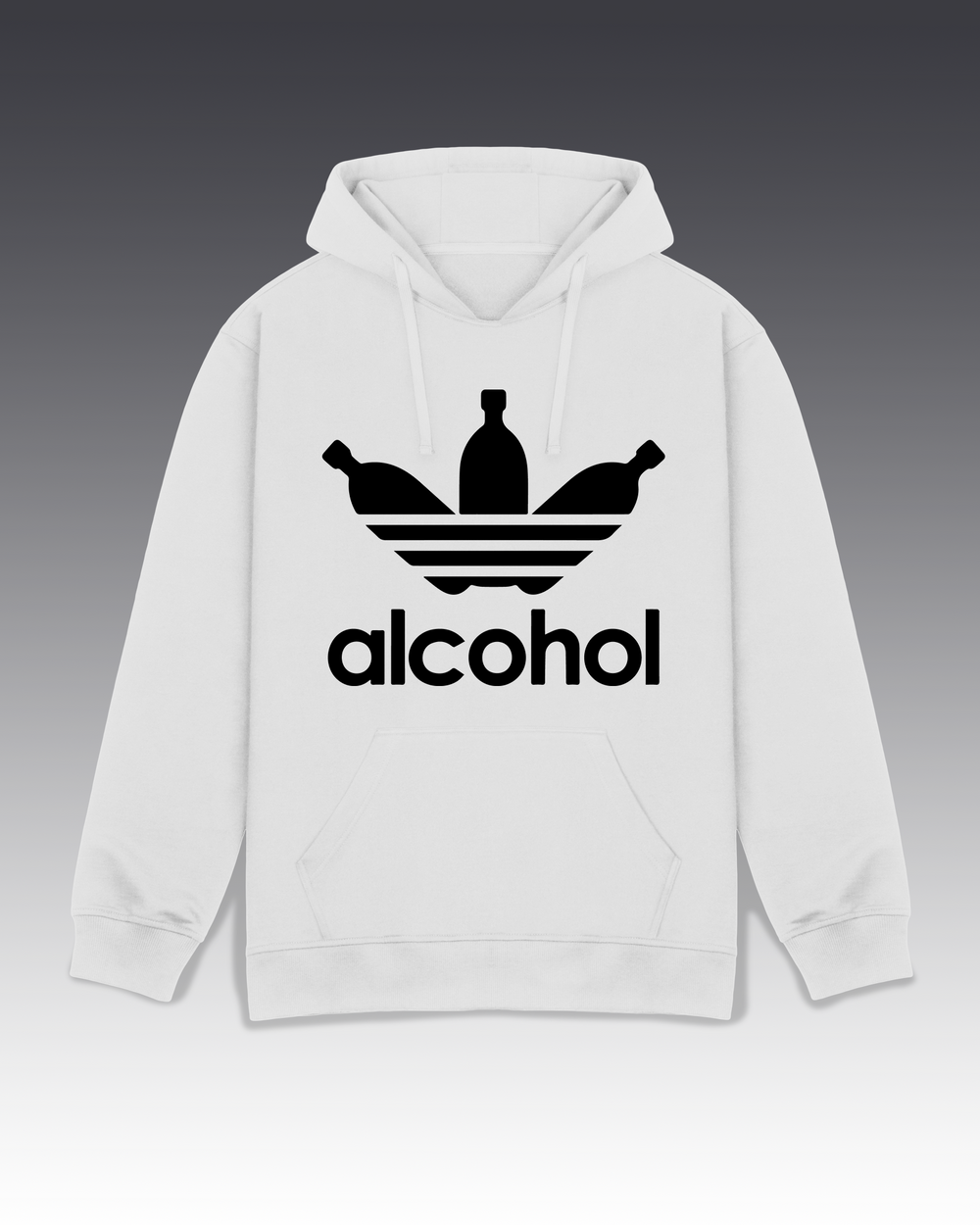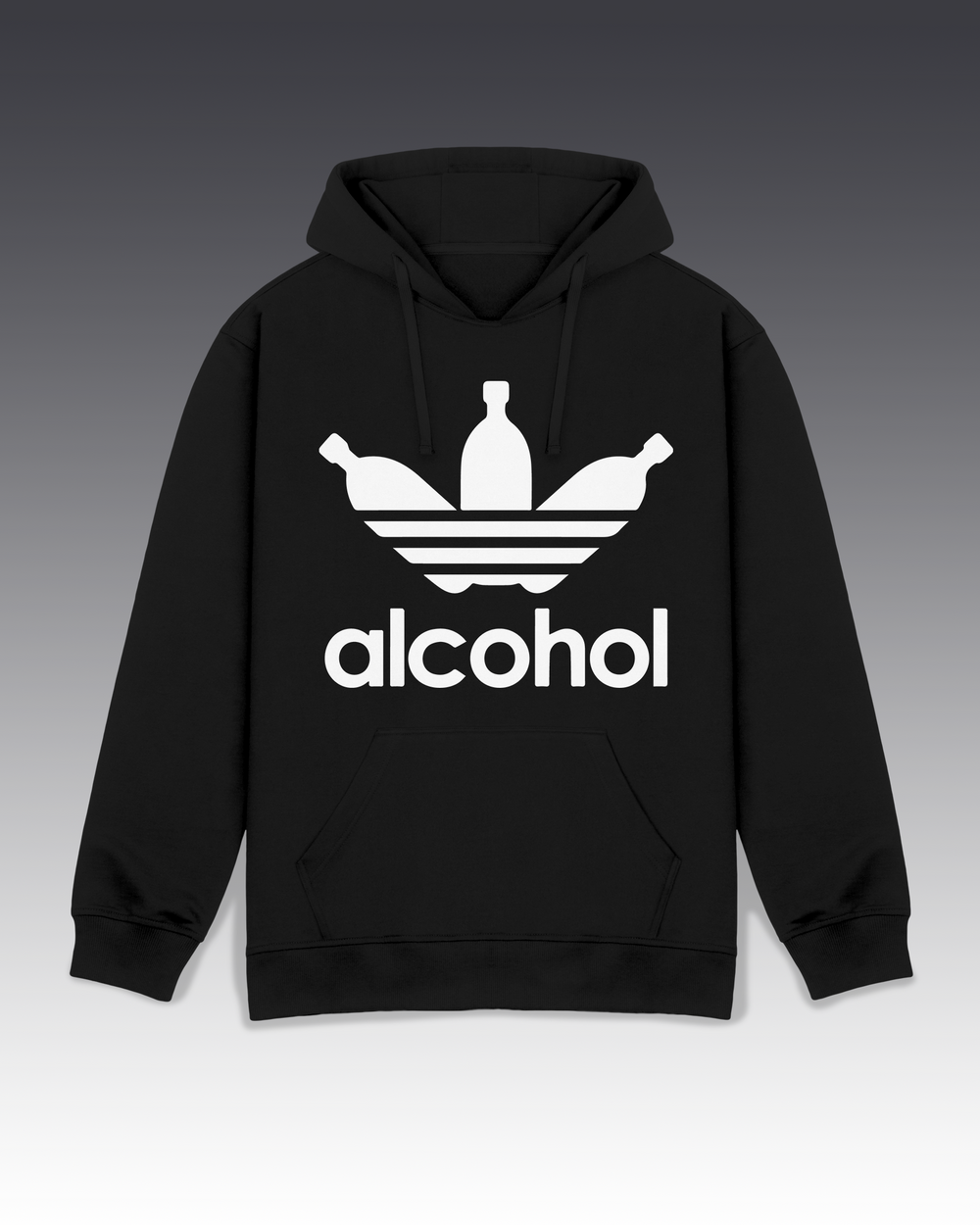 Stay comfortable on your night out with this Original DIYANYONE Cotton Blend Hoodie. This premium, heavyweight pullover displays the iconic "alcohol" parody logo, perfectly blending athletic-wear aesthetics with bar culture humor. The design offers exceptional warmth and is ideal for casual outings, parties, or trips to the pub. It's a humorous and stylish way to show your love for good drinks and good company.