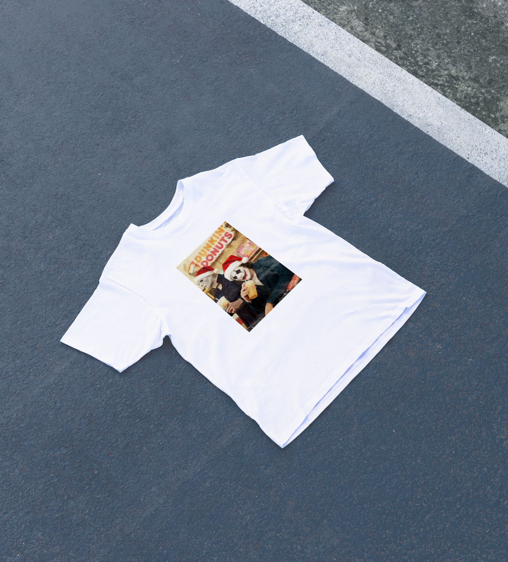 Embrace the dark side of the holidays with this Original DIYANYONE Cotton T-Shirt. It features a viral-style, dark humor graphic of horror film icons in Santa hats, enjoying iced coffee at a Dunkin' Donuts counter. This design is a hilarious pop-culture meme that perfectly captures the modern, absurd juxtaposition of holiday cheer and scary movie culture. It's the ultimate conversation starter for Christmas parties and a great piece of retro movie fan apparel.