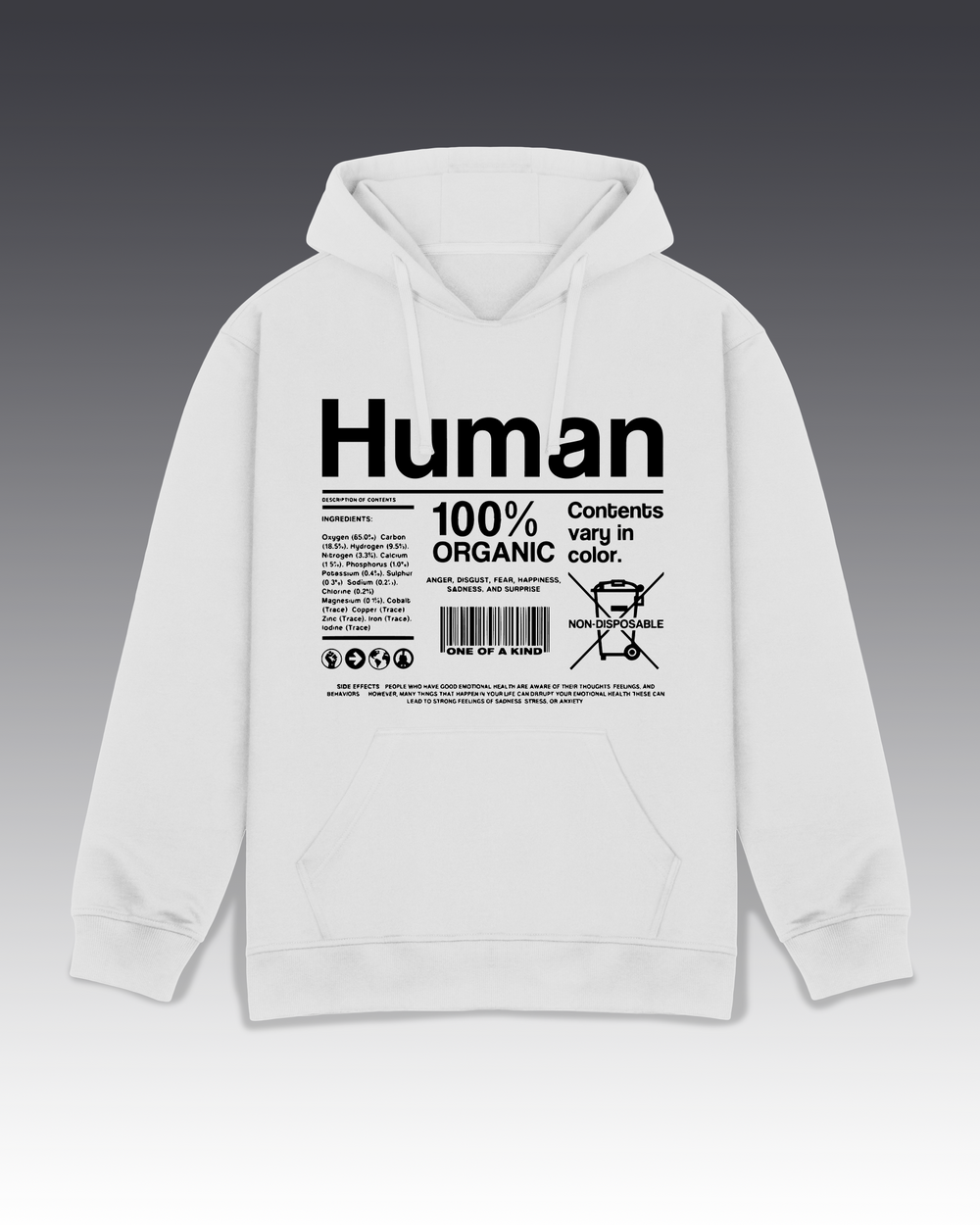 Stay cozy while delivering a conceptual critique with this Original DIYANYONE Cotton Blend Hoodie. This premium, heavyweight pullover displays the "Human 100% ORGANIC" graphic, styled after an industrial product label. The design is a humorous, sarcastic take on modern society, labeling humanity itself. It offers exceptional warmth and is ideal for those who favor existential humor and unique, thought-provoking streetwear.