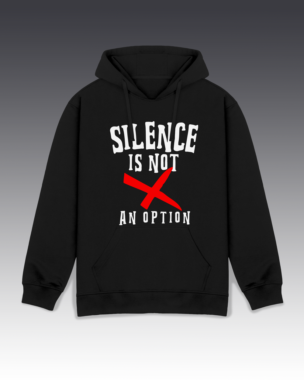 Keywords: heavyweight silence is not an option hoodie, DIYANYONE original activist pullover, social justice graphic hooded sweatshirt, protest statement apparel, bold advocacy pullover, human rights statement hoodie