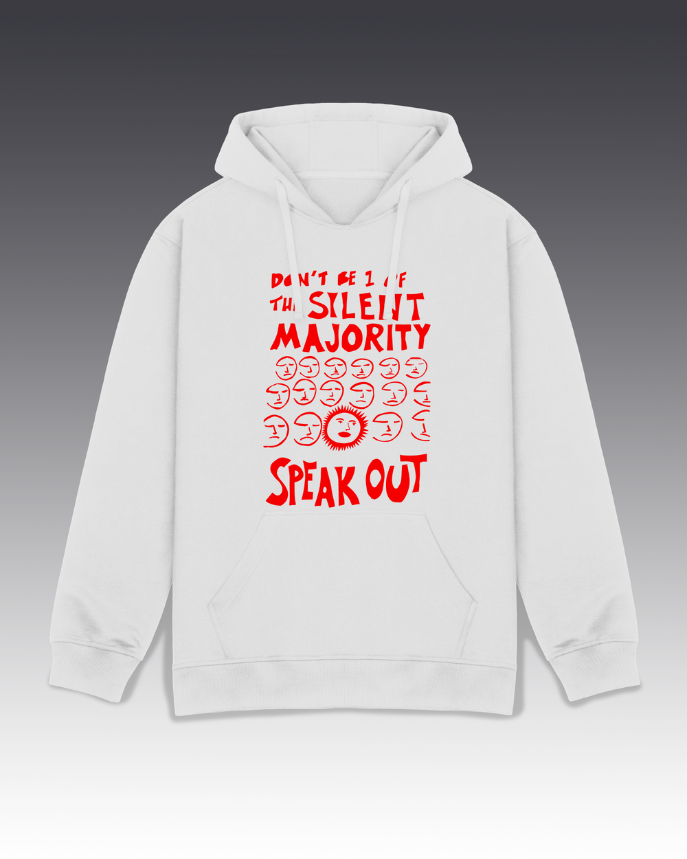 Stand out and speak your truth — this DIYANYONE Original cotton T-shirt/hoodie features a bold red hand-drawn design that reminds us not to be part of the “silent majority.”