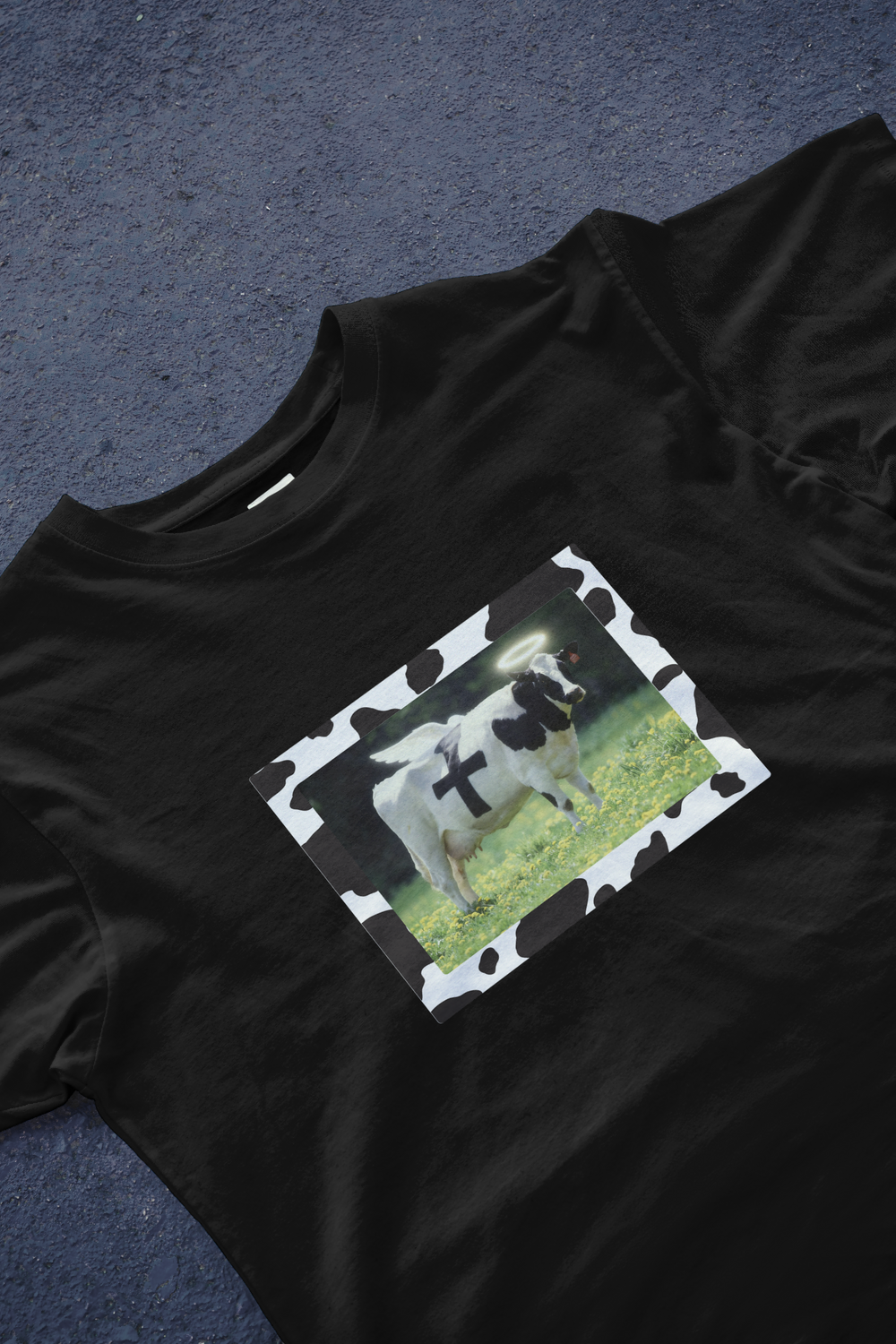 The ultimate conversation starter tee! Features a surreal image of a 'Holy Cow' with a halo, wings, and a bold black cross, set against a fun cow-print border. Perfect for those who love irony, surrealism, and farm humor.