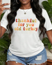 The perfect humorous tee for your Thanksgiving dinner! Features the playful and punny quote, "Thankful to you. Old Turkey." A great way to share gratitude and get a laugh. Soft, comfortable cotton perfect for the holiday feast.