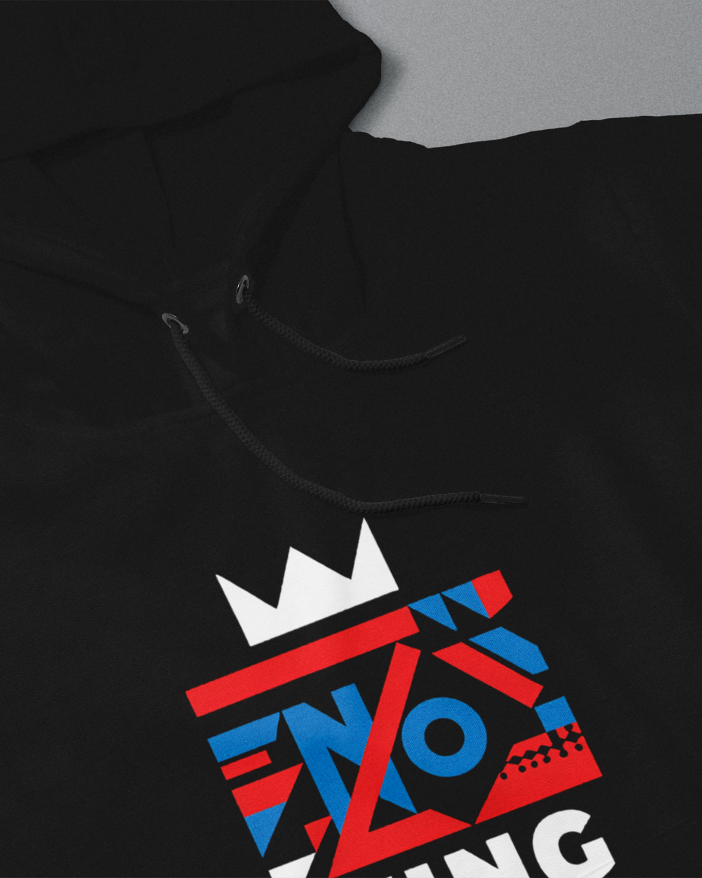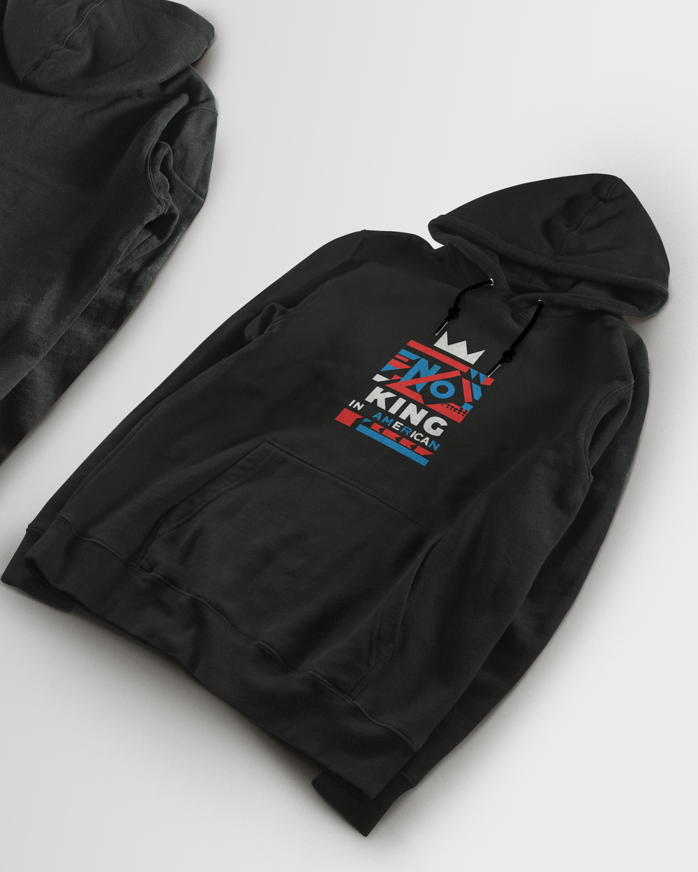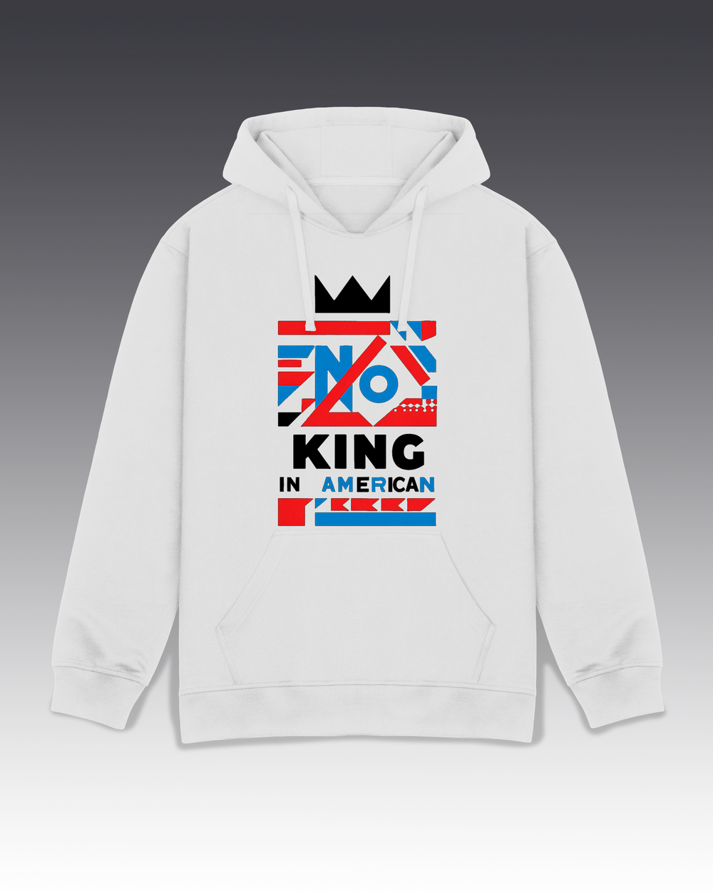 Keywords: No King In American Hoodie, Geometric Abstract Pullover, Anti-Monarchy Sweatshirt, Contemporary Patriotism Gear, Liberty Graphic Hoodie, DIYANYONE Original, Political Statement Apparel, Minimalist Crown
