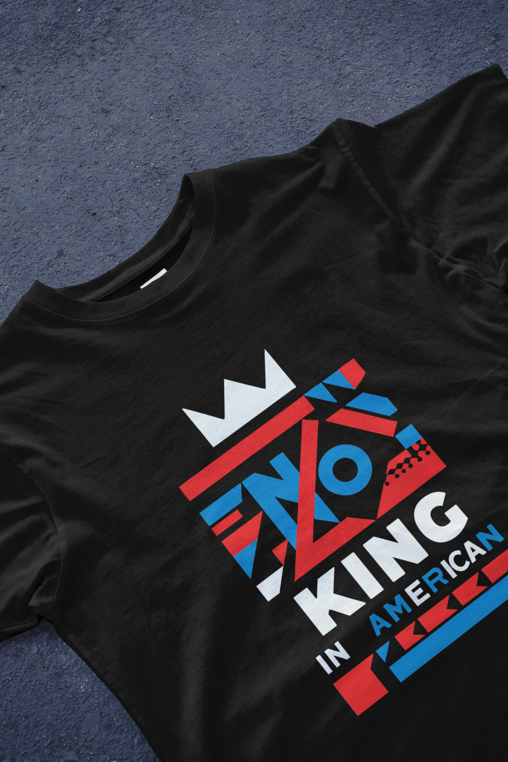 Designer Original! This soft 100% cotton tee features a powerful, abstract geometric design using American flag colors to spell out "NO KING IN AMERICAN," topped with a minimalist crown. This design is a modern, stylish take on the core American spirit of republicanism and liberty, signaling a strong anti-authoritarian stance. A bold and contemporary political statement.