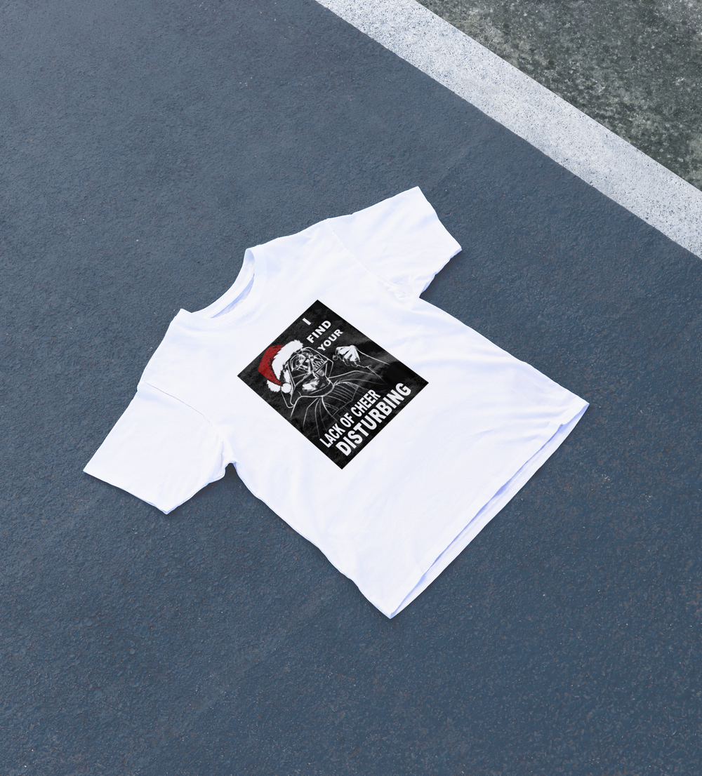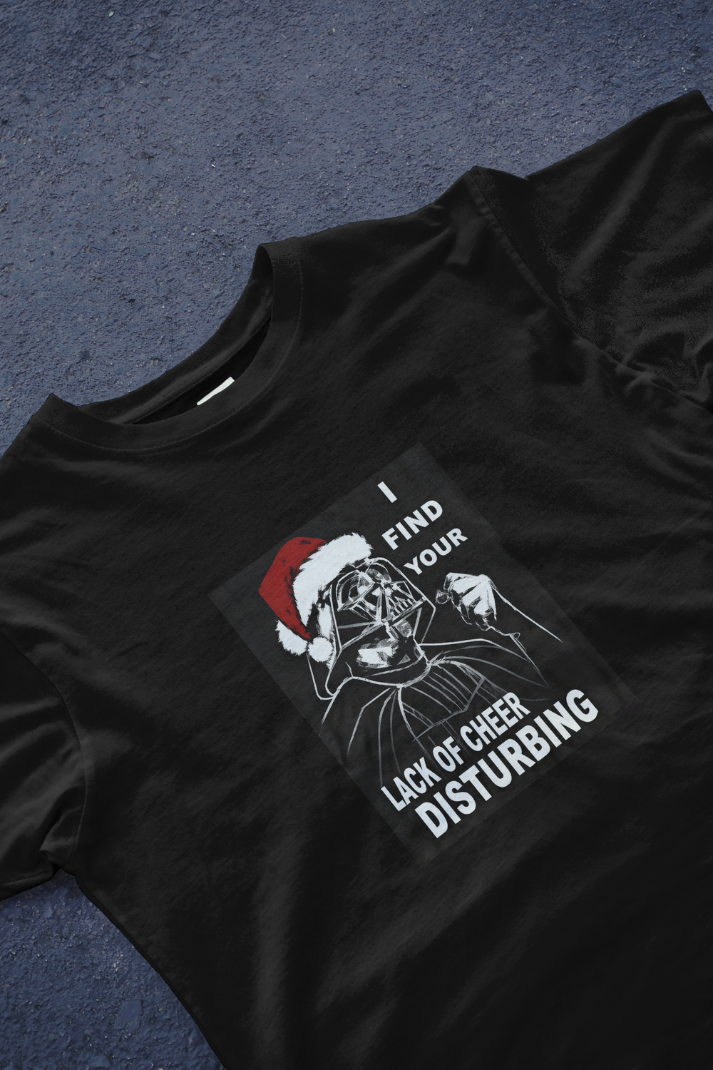 This soft, comfortable t-shirt features the iconic Darth Vader wearing a Santa hat, delivering the hilarious holiday parody quote: "I FIND YOUR LACK OF CHEER DISTURBING." The design cleverly merges classic sci-fi with festive sarcasm, perfect for anyone who prefers the "dark side" of Christmas cheer. A fun, edgy gift for movie buffs.