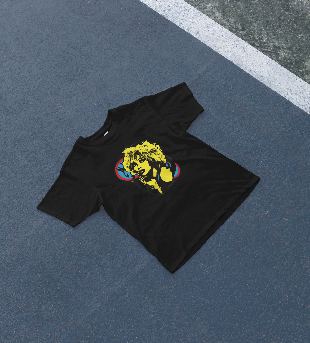 This soft, comfortable t-shirt features a vibrant, high-contrast graphic of a fierce woman with bright yellow hair, rendered in a striking Pop Art/New Wave style. The design captures the bold, rebellious energy of the 1980s music and art scene, symbolizing confidence and attitude. A unique, retro statement piece.